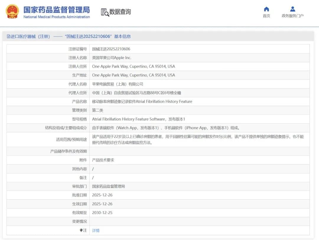 最近刷到一条重磅消息:苹果的“移动脉率房颤迹象记录软件”(也就是Apple Watch的Atrial Fibrillation History Feature)在2025年12月26日正式拿下NMPA进口二类医疗器械注册证,证号国械注进20252210606。这不是整个手表获批,而是针对房颤监测这项软件功能,专为22岁以上已确诊房颤患者设计,能回顾性估算房颤发作时长比例,并与生活方式数据关联分析。苹果官方回应说,正在走正规流程,很快就能在中国落地使用。