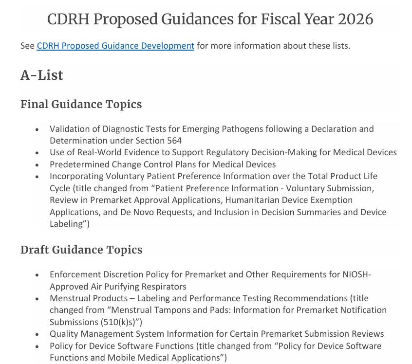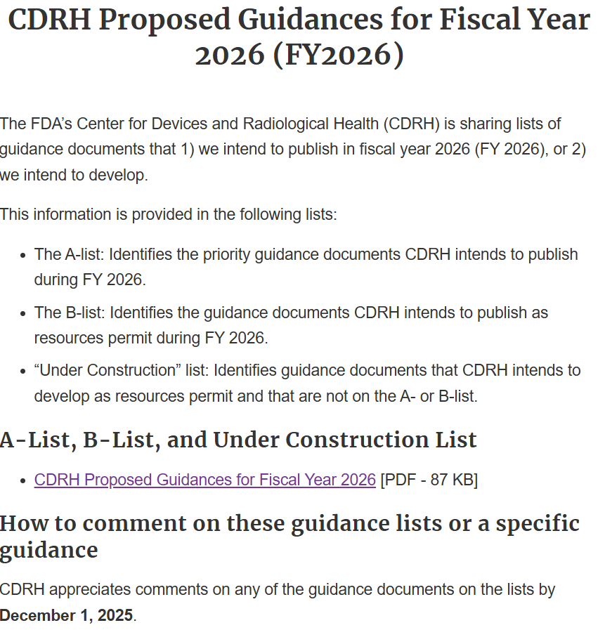 2025年秋季,FDA CDRH公布了Fiscal Year 2026(2025.10.1–2026.9.30)拟发布指导文件清单。这份清单虽然条目数量收紧,但A-List的含金量和针对性达到近年峰值,尤其是对AI/ML、SaMD、数字疗法和高风险诊断类产品影响最为直接。