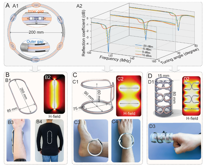 2)“可调、可定制、可自适应”的三位一体:引入可旋转的“调谐套筒”实现~30–60 MHz范围的频率微调;多缝隙设计让直径/形态可定制且频率更稳定;在缝隙处并联PIN二极管实现“低功率接收增强、高功率发射去耦”的自适应响应——发射阶段自动失谐、接收阶段增强磁场。