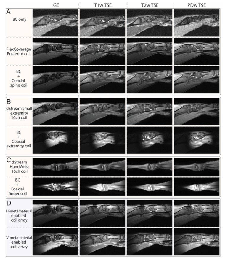 • 阵列(超材料)实验:在扩展覆盖的同时,SNR并未被稀释,且较同类商用线圈有明显提升。