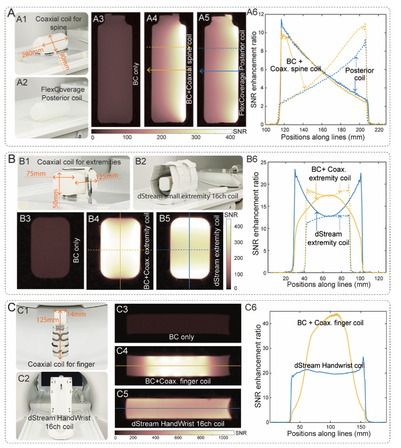 • 幻影实验:与机体发射线圈(birdcage, BC)相比,贴合脊柱的CCR可带来约10倍SNR提升;贴合“小体部”的CCR约17.5倍;“手指线圈”约44倍。与飞利浦商用16通道小体部线圈/手腕手指线圈相比,CCR在中心区可实现更高的SNR。