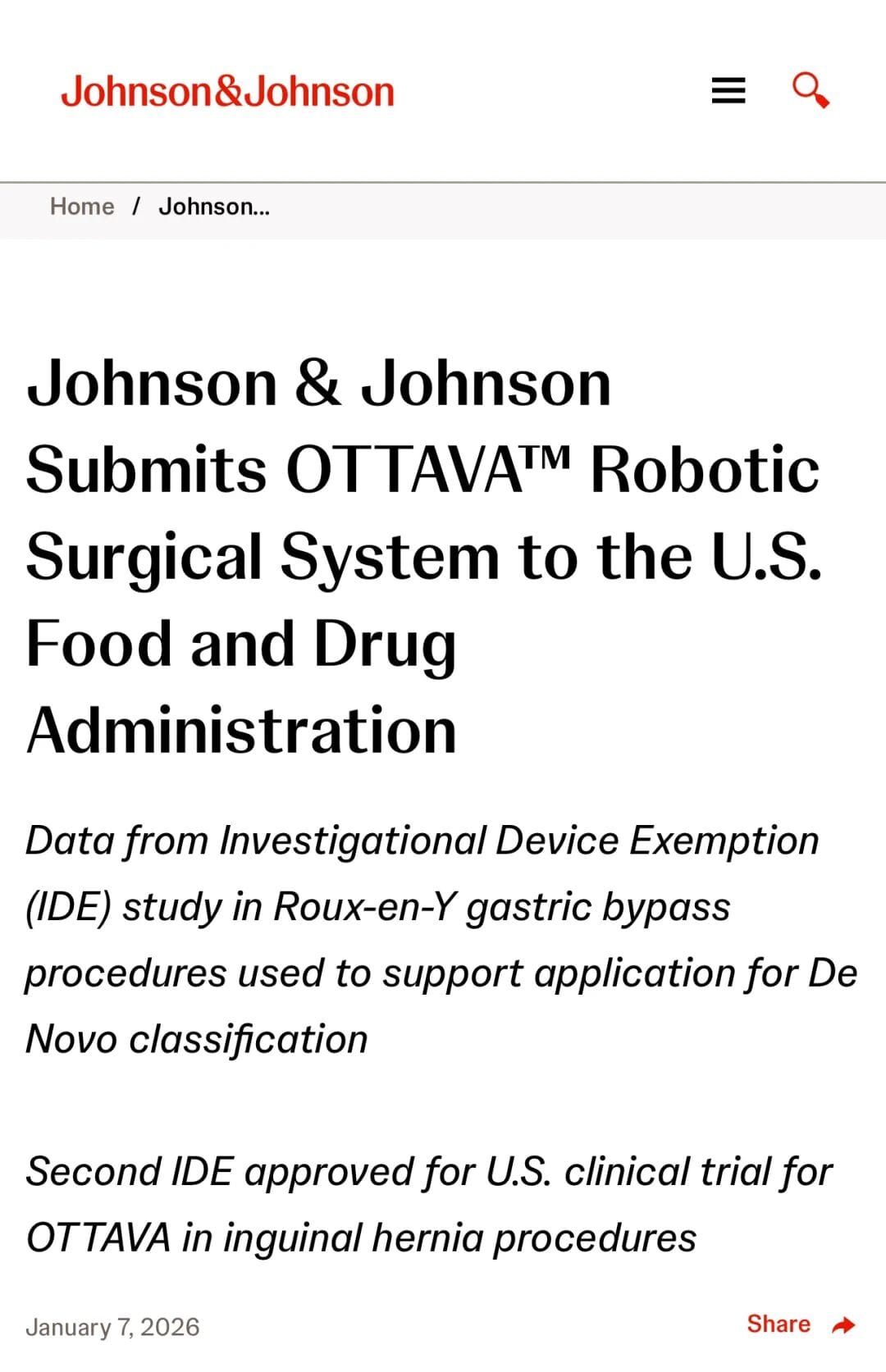 年初,强生(Johnson & Johnson)对外确认,已向 FDA 提交其 OTTAVA 手术机器人系统的 De Novo 申请,覆盖普通外科相关适应症。
