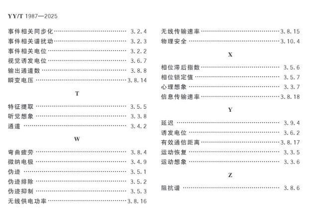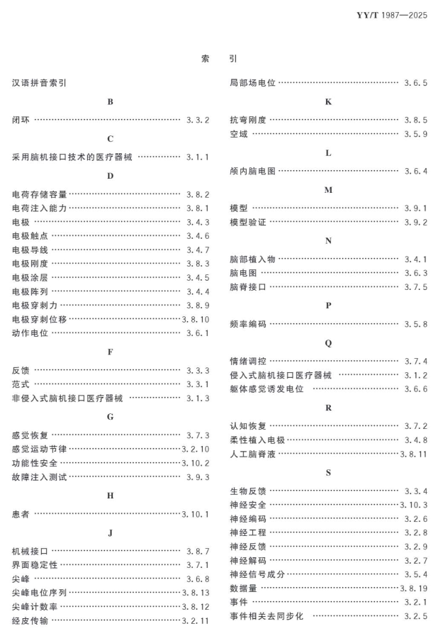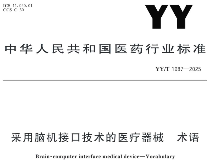 YY/T 1987-2025是我国首个脑机接口医疗器械标准,系统定义了80+核心术语,如“侵入式脑机接口医疗器械”“神经解码”“闭环反馈”等。